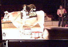 Hund reitet auf Kuh