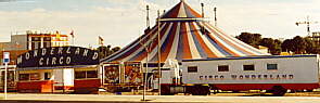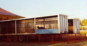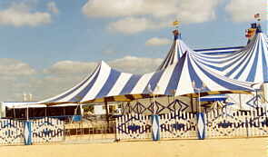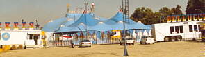 |  |  | | stehen und darin eine 12 m runde Manege. Die Längskuppel ist tiefer gezogen. Ein großzügiger Manegeneingang und acht Reihen Gradin mit weißen Schalensitzen geben diesem Zelt ein sehr großzügiges aber keineswegs großspuriges Ambiente. Der Wagenpark der Direktion ist sehr ordentlich, der der Arbeiter und Hausartisten weit weniger gepflegt. Neben dem offenen Vorzelt steht ein Sattelschlepper mit Löwen, Tigern und Bären, die auch in