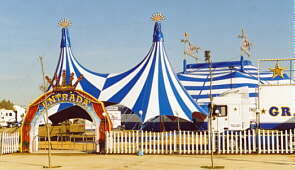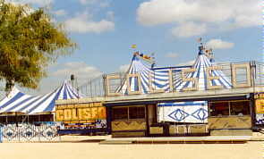 |  |  | | Nur wenige Kilometer weiter fand ich den Circo Italiano der Geschwister Rossi, die in Granoliers komplett neue Zeltanlagen aufgebaut hatten. Ein blauweiß gestreiftes 38 m Chapiteau mit aufwendiger Außenbeleuchtung.